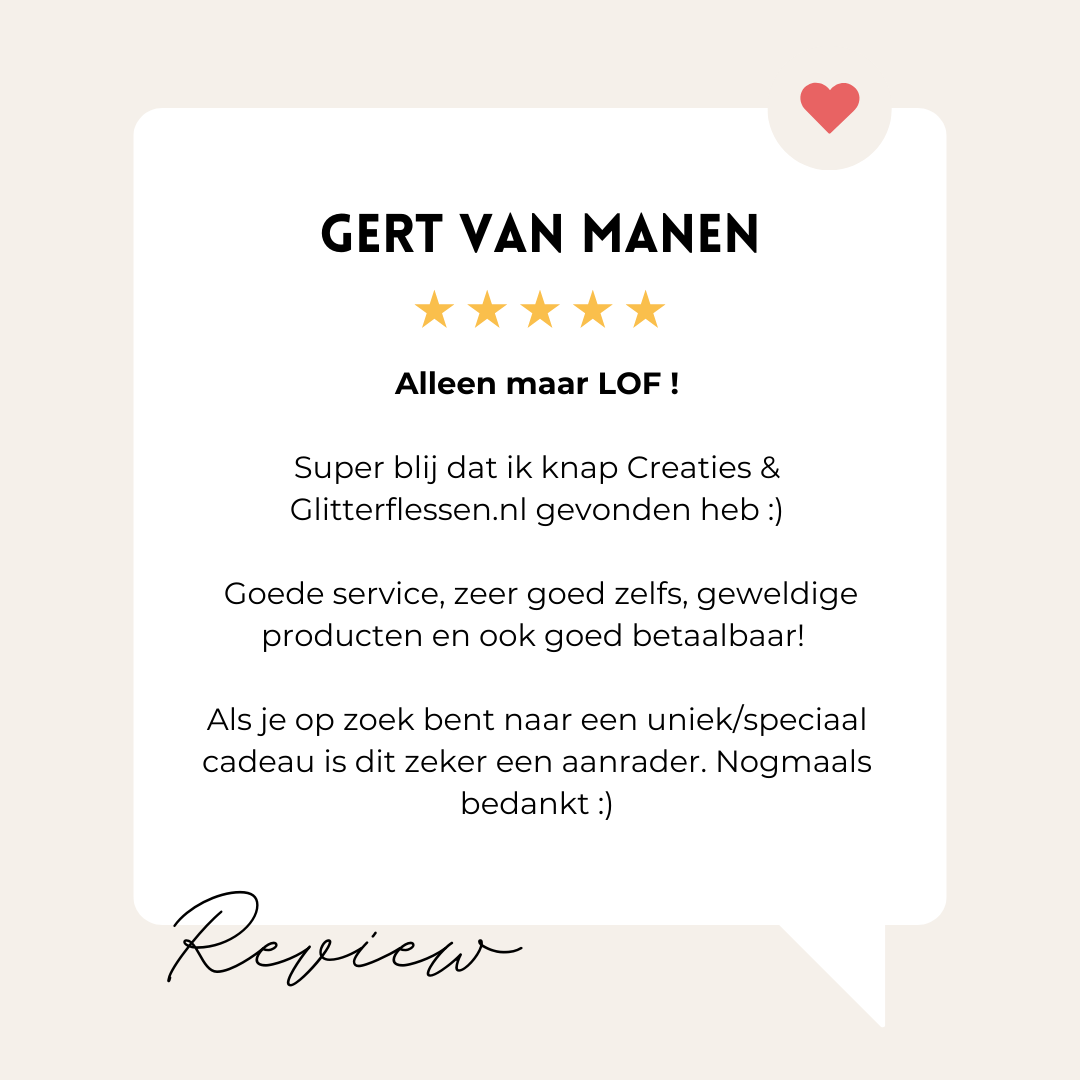 Welkom bij Glitterflessen, de plek waar creativiteit en vakmanschap samenkomen. Onze flessen worden met veel zorg met de hand gemaakt, wat elke creatie uniek maakt. Bovendien bieden we de mogelijkheid om je fles volledig te personaliseren, zodat je een werkelijk speciaal stuk in handen hebt.