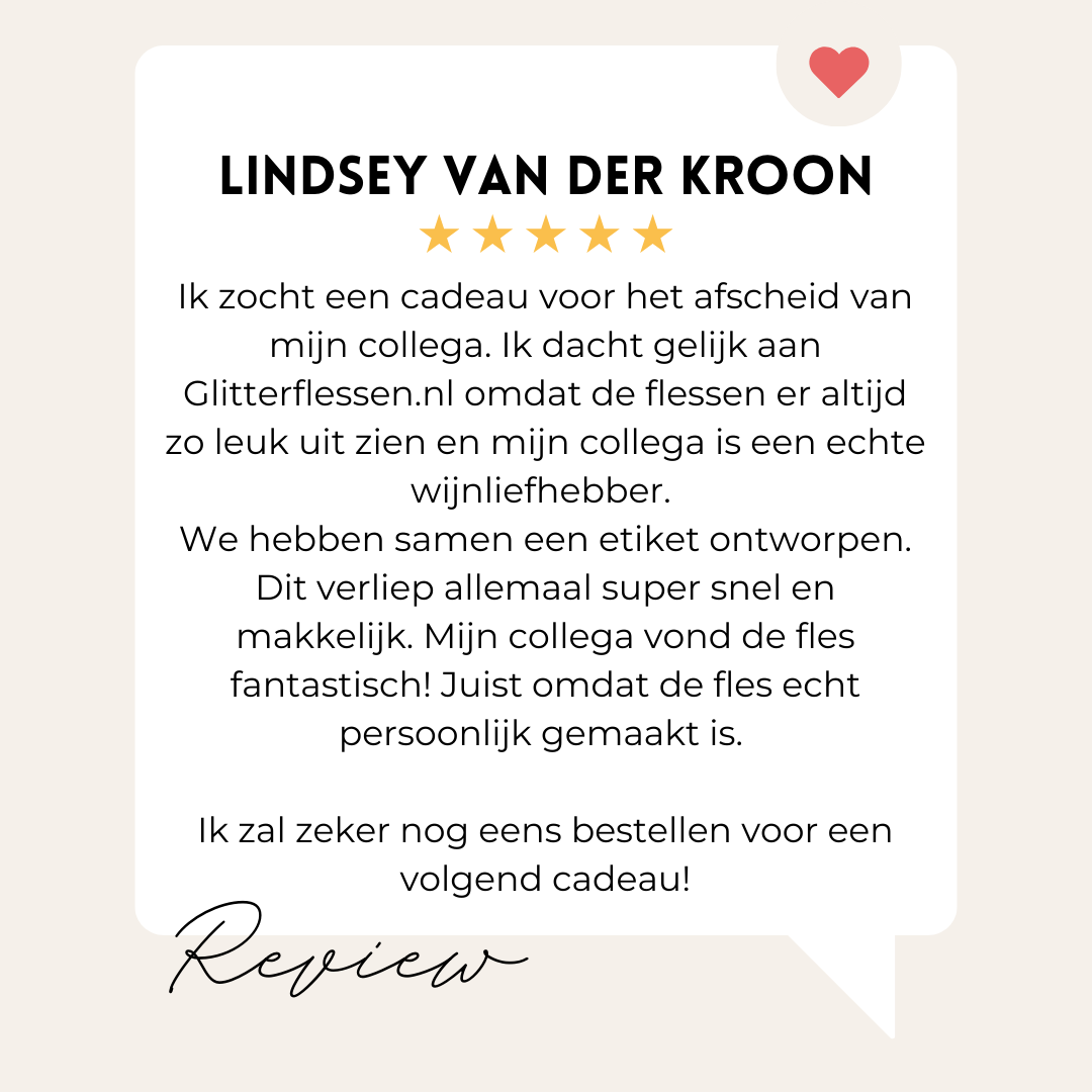 - je de fles kan bewaren en er mooie (droog)bloemen in kan stoppen? Zo kan je nog veel langer genieten van de fles. - we ook grote bestellingen aannemen? We hebben al meerdere bedrijven blij mogen maken met deze unieke relatiegeschenken met eigen bedrijfslogo! - we extreeeeeem veel kleuren glitters hebben? Je kan het zo gek niet bedenken!